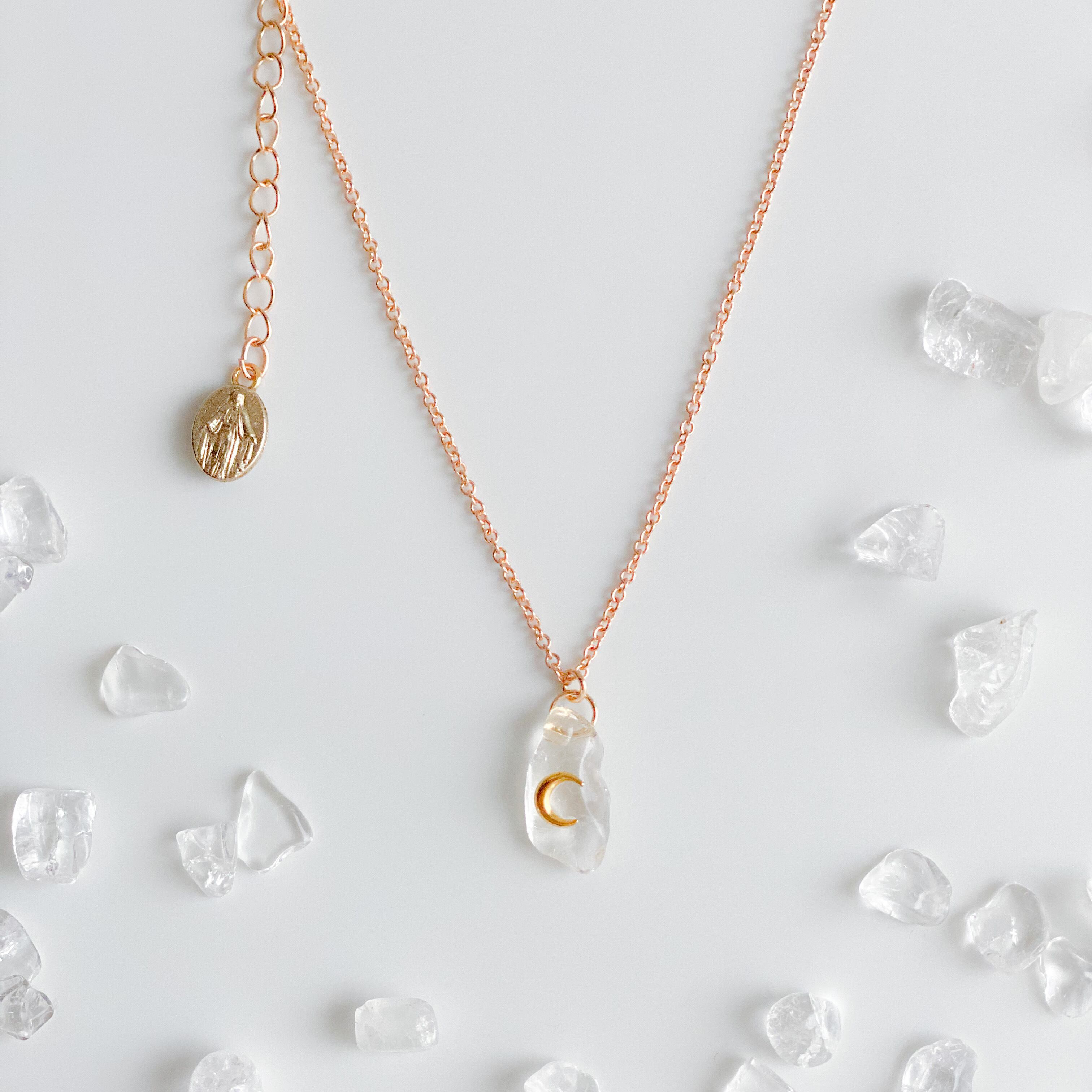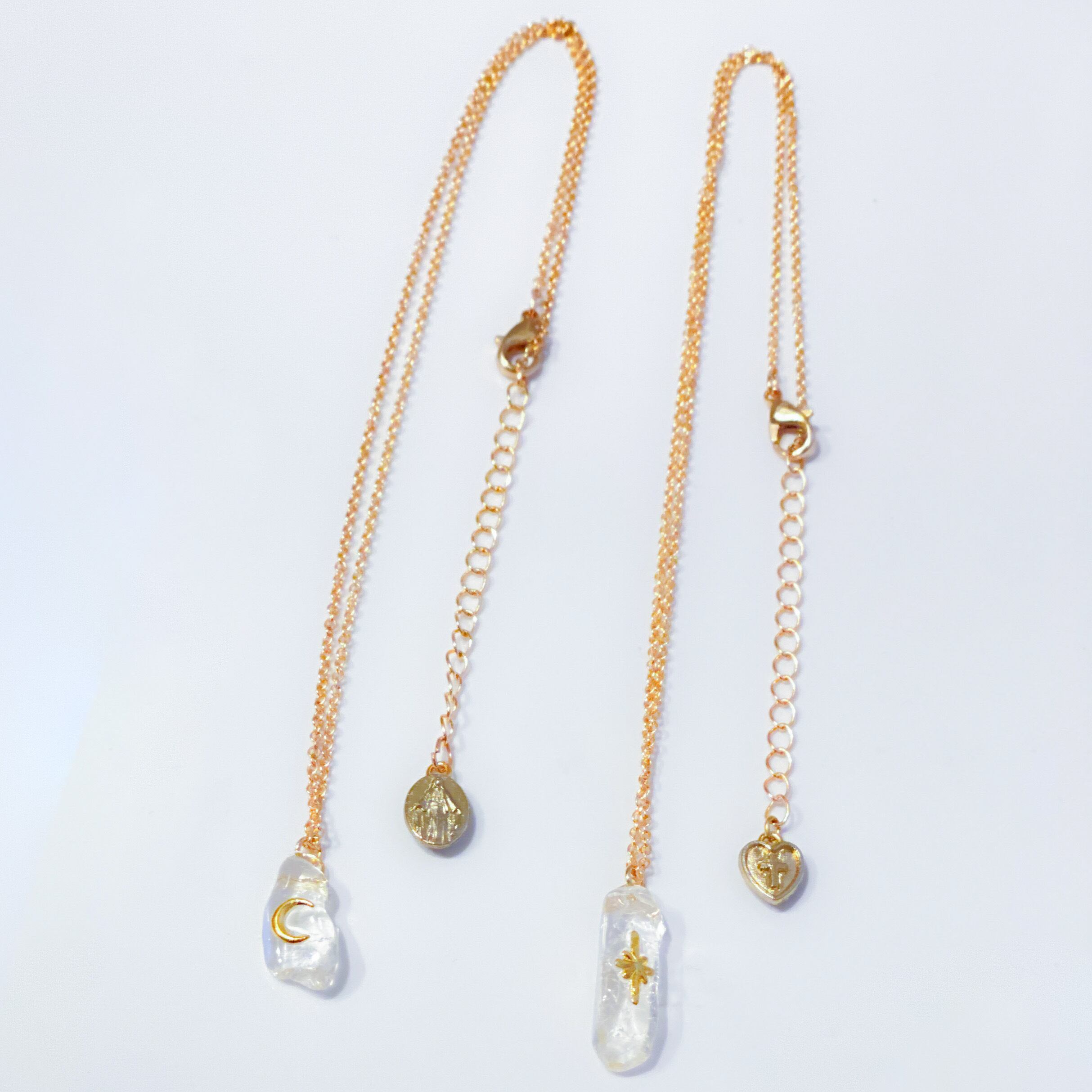 こちらは、光と月のマークが入ったデザインの水晶チャームネックレスです。